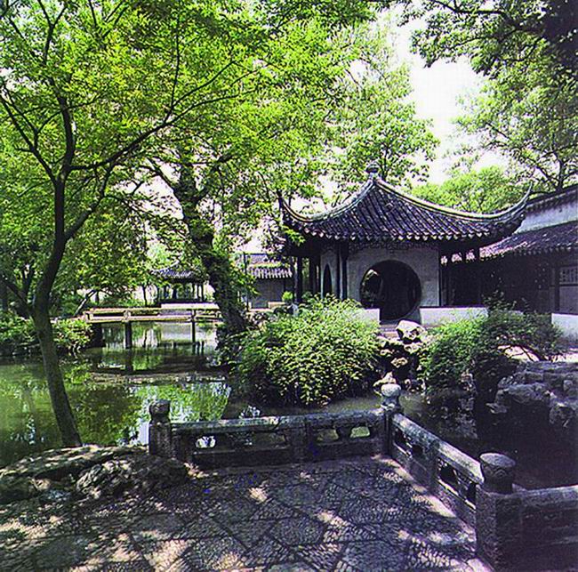拙政園始建于明正德四年(公元1509年)。它雖經(jīng)過幾百年的蒼桑變遷,但這里處處山水明秀,廳榭典雅,花木繁茂,漫步在其中,你仍能感受到其平淡疏朗、曠遠(yuǎn)明瑟的明代氣息,游過全園,給我印象最深的是位于中部花園的最東面的"梧竹幽居",這里造型非常別致,四個大大的圓洞門使人馬上聯(lián)想起八月十五晚上的月亮。而更神奇的是如果你站在亭子里向外看,這四個圓洞門又恰似四個巨大的鏡框,鑲嵌著蘇州園林一年四季的風(fēng)光。